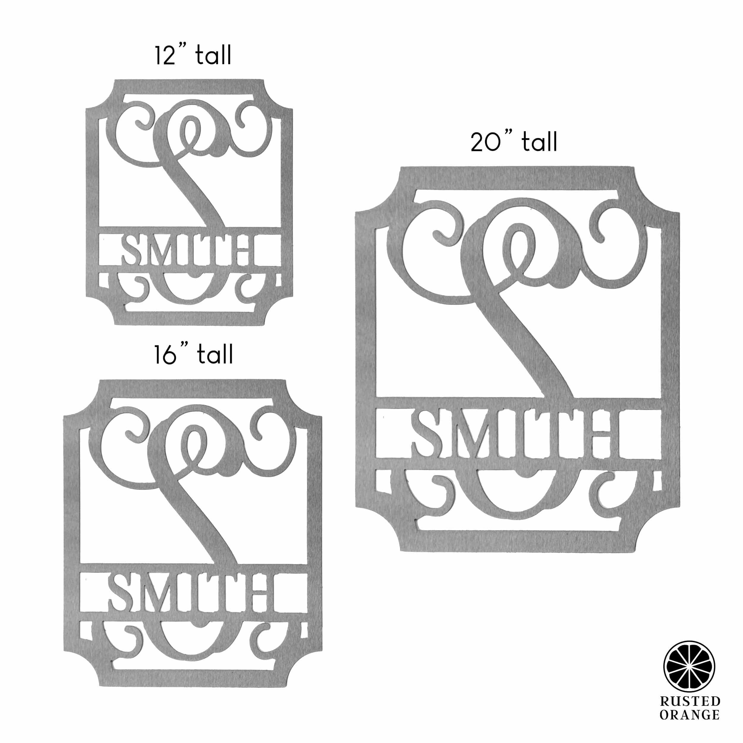Make a bold and elegant statement with our Personalized Embellished Monogram Sign. This rectangular metal wall art features a large, decorative script initial framed in a sleek rectangle, with a bold all-caps serif nameplate running through the center—perfect for a family name, couple's last name, or established date (up to 11 characters).